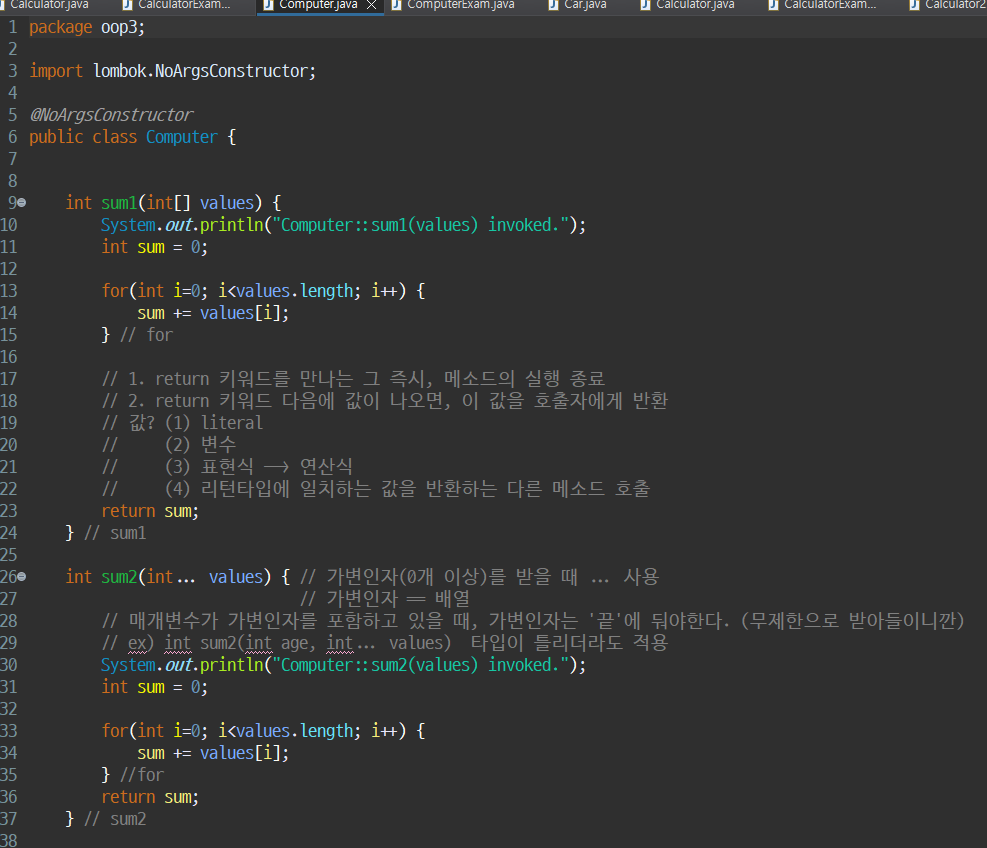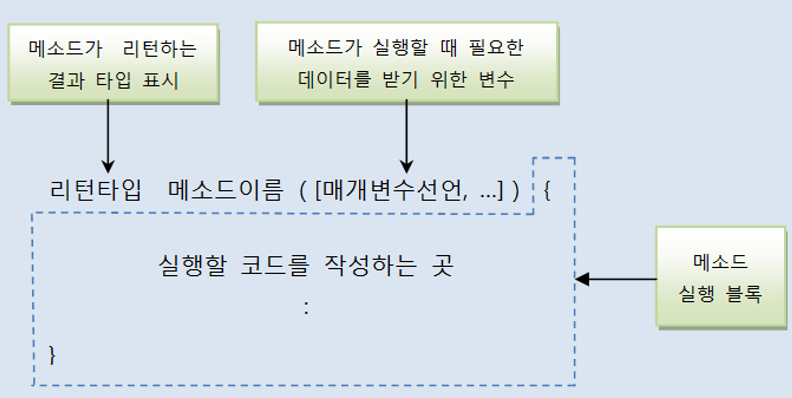 - 메소드 호출하면 중괄호 { } 블록에 있는 모든 코드들이 일괄 실행