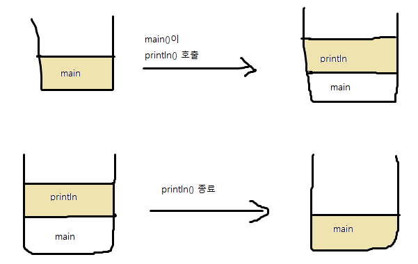 --> 메서드에 값이 전달되며, 작업 ㄱㄱ --> 작업을 마치면 호출한 곳으로 돌아온다.
