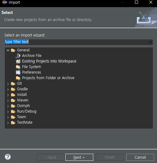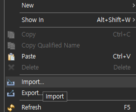 이클립스 workspace 빈공간 우클릭 -> import 선택
